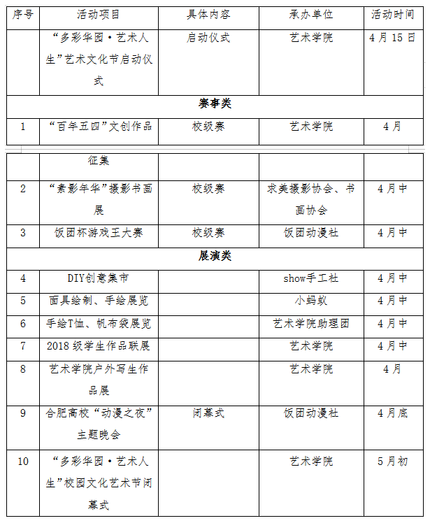 二、活動時間 2019年4月 活動承辦:藝術(shù)學(xué)院團總支 活動協(xié)辦:藝術(shù)學(xué)院學(xué)生會、藝術(shù)學(xué)院助理團、手工社、小螞蟻協(xié)會、書畫協(xié)會、攝影協(xié)會、論智桌游社、排球社、動漫飯團社。 (一)4月18日中午12:00(如遇天氣原因?qū)⒄{(diào)整日期)于翰林廣場啟動“活動主題·藝術(shù)人生”校園文化藝術(shù)節(jié)啟動儀式。二級學(xué)院由行政副院長領(lǐng)隊,組織團總支書記,各級各類學(xué)生組織骨干代表、學(xué)生代表5人參與啟動儀式;校級學(xué)生組織由校團委統(tǒng)一組織。各單位提前20分鐘到達(dá)廣場,按照指定位置列隊,著裝要求以簡單大方為主,佩戴團徽。 (二)各學(xué)院、各組織鼓勵并動員學(xué)生參與“多彩華園·藝術(shù)人生”文化節(jié)系列活動,通過文化藝術(shù)節(jié)系列活動培養(yǎng)學(xué)生藝術(shù)審美,豐富學(xué)生的藝術(shù)生活。活動具體安排如下: (一) 關(guān)注微信公眾號“安徽新華學(xué)院團委”,點擊菜單欄“PU口袋校園”注冊并登陸,首頁找到活動,點擊“報名”,參與活動。 (一)校園文化月活動作為高校校園文化內(nèi)涵的一種外在表現(xiàn)形式,是展示學(xué)院師生良好精神風(fēng)貌的重要窗口,對于進一步激發(fā)廣大師生工作學(xué)習(xí)的積極性和主動性,對于創(chuàng)造和諧、求知、進步的育人環(huán)境,具有十分重要的意義。 (二)藝術(shù)學(xué)院團總支、學(xué)生會要發(fā)揮骨干作用,強化措施,組織得力,注重實效。在開展活動時要注意調(diào)動學(xué)生的積極性、創(chuàng)造性,增強活動的實效性,擴大學(xué)生的參與面,爭取使每位同學(xué)都參加一項活動,把本次文化月辦成學(xué)生參與面廣、活動多、質(zhì)量高的一屆盛會,讓學(xué)生真正在活動中施其所長,發(fā)展個性,使青年學(xué)生在活動中得到教育和熏陶,不斷擴大校園主流文化的影響力。 (三)各項活動要圍繞“多彩華園·藝術(shù)人生”的主題,抓住有利契機,圍繞學(xué)生成長、成才精心設(shè)計,認(rèn)真組織落實,力求精品。所有參展作品應(yīng)適合當(dāng)代大學(xué)生的基本特征,體現(xiàn)當(dāng)代青春風(fēng)采。參賽所需用品自備。 (四)各二級學(xué)院積極鼓勵并動員學(xué)生參與“多彩華園·藝術(shù)人生”文化節(jié)系列活動,立足文明校園建設(shè),引導(dǎo)學(xué)生向上生活,躍動青春。各社團結(jié)合主題開展活動,活動結(jié)束將于閉幕式進行相關(guān)獲獎表彰。